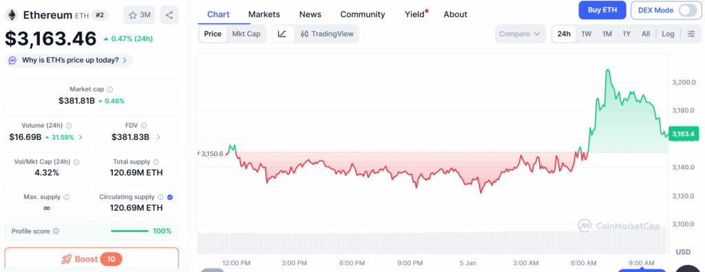 以太坊的关键阻力位原设定于3,000美元附近,现价已升至3,163.43美元,24小时上涨0.47%,七日涨幅达4.25%。其独立市值增长0.2%,24小时交易量显著提升35.47%。