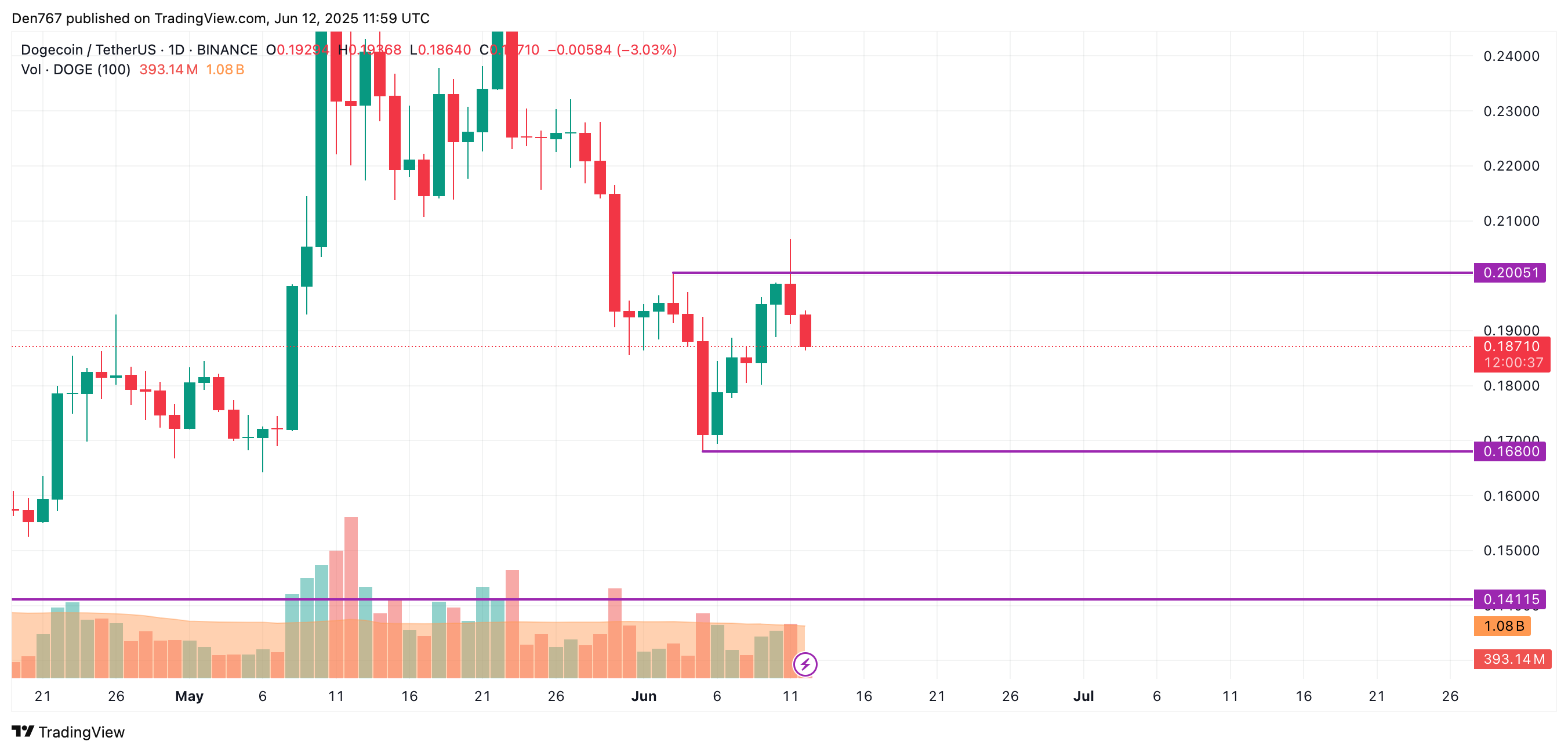 DOGE价格在跌破0.19美元区间后持续走低。若日线收盘低于该价位,回调可能延续至0.1850美元支撑区域。