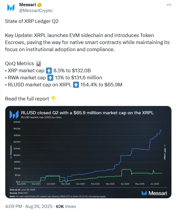 Ripple旗下稳定币RLUSD在第二季度飙升154.4%,市值达到6590万美元,成为XRPL上规模最大的稳定币。XRPL链上实物资产总市值创下1.316亿美元历史新高,其中代币化基金、商业票据和房地产贡献显著。
