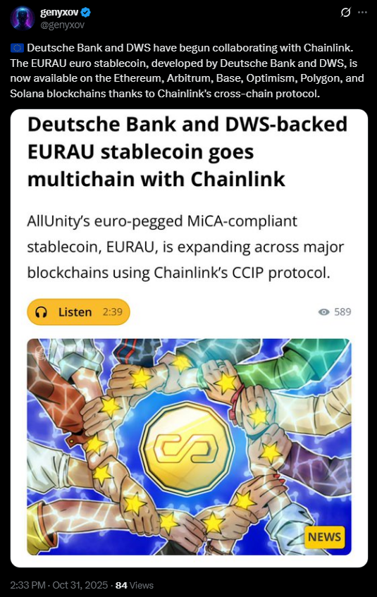 随着$LYNO加速发展,AllUnity正通过Chainlink基础设施将其欧元稳定币EURAU扩展到多个区块链。这一整合增强了欧元锚定资产的流动性和互操作性,突显了与$LYNO多链套利使命完美契合的更广泛DeFi趋势。