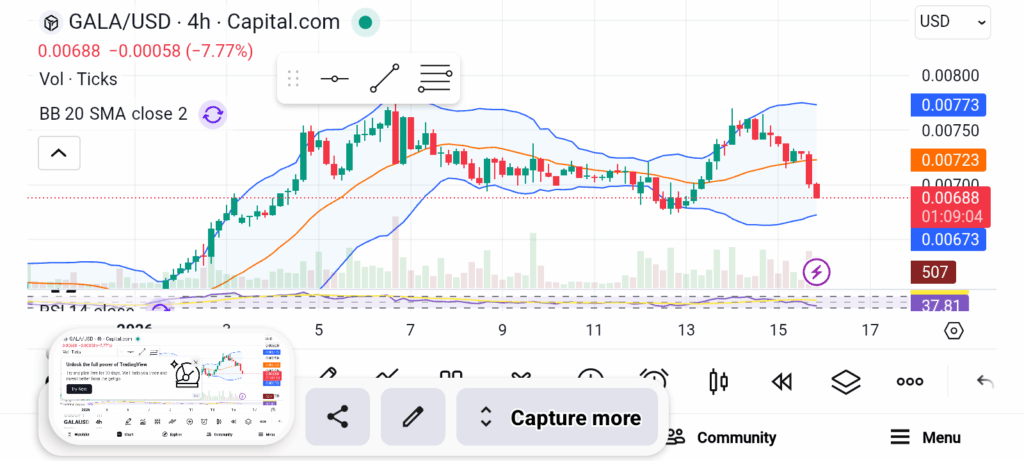 从日线图观察,GALA仍处于宏观下行趋势中,价格持续低于所有主要移动平均线,确认空头仍主导市场。但值得关注的是,下跌动能已开始减弱:MACD柱状图在基线附近走平,释放出抛售压力缓解的信号。这一变化虽未构成趋势反转确认,但市场环境已较此前温和。