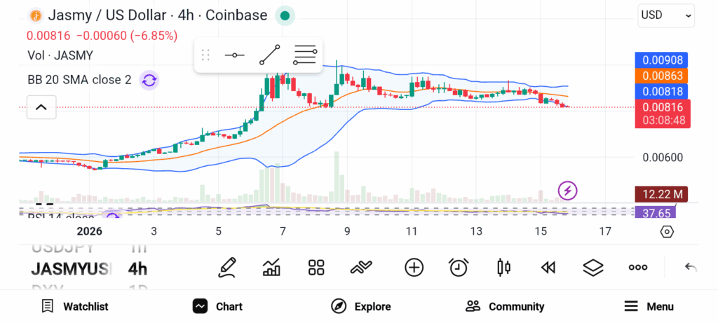 JASMY目前仍受制于明确的下行趋势,价格处于所有关键移动平均线下方,这反映了较高时间维度上空头力量的持续主导。然而动量指标已显现细微改善:MACD柱状图持续收缩,信号线逐步抬升,此类变化常出现在早期筑底阶段。