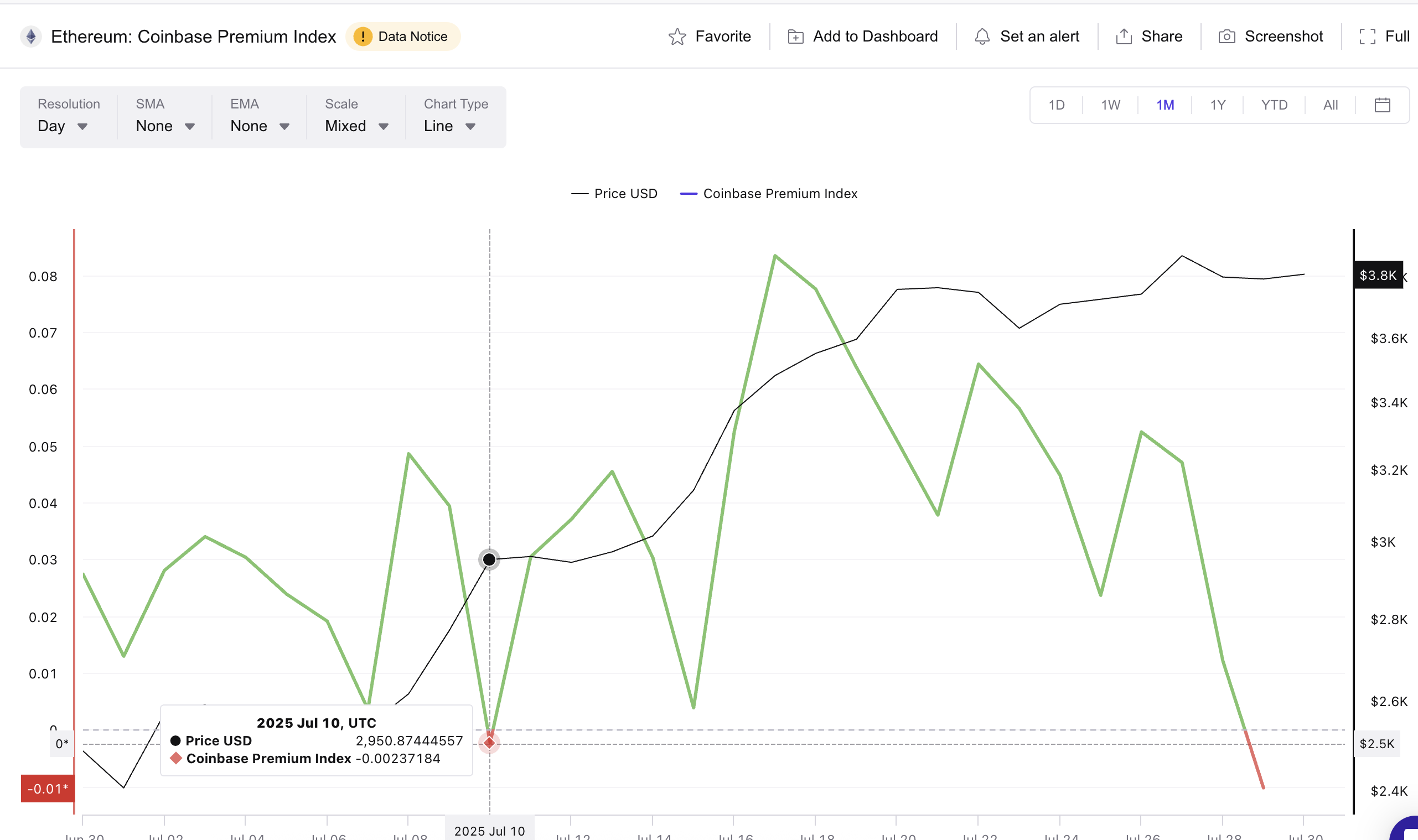 对照7月10日该指数仅短暂跌至-0.0023且ETH价格几无波动的历史,本轮溢价转负幅度更深,暗示美国买家正在撤退。当大盘维持高位而美国大额资金需求出现缺口时,机构买单的缺失可能削弱ETH上涨根基。