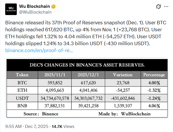 最新一期币安储备证明快照显示,以太坊和USDT余额出现下降。由于用户在12月增持了更多BTC,比特币持仓量有所上升。USDC超额准备金增加,而ETH和SOL超额余额则降为零。