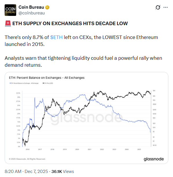 Coin Bureau的独立分析为币安之外的ETH供应趋势提供了更多背景。数据显示,中心化交易所持有的ETH占比已降至总量的8.7%,创下2015年以来新低,这可能限制活跃交易的ETH流通量。