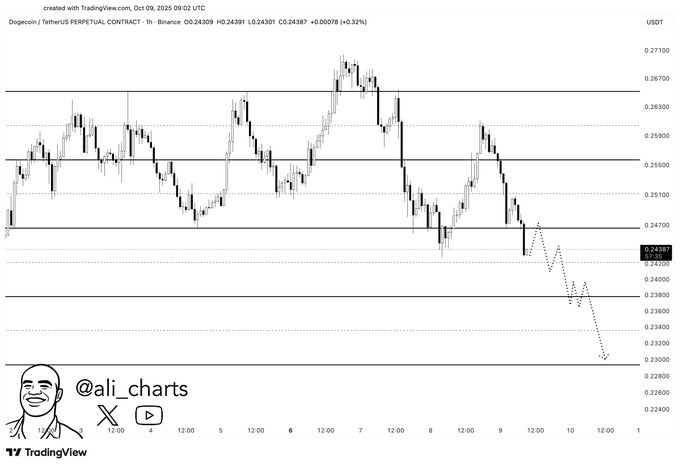 分析师Ali(@ali_charts)指出"狗狗币或将重新测试0.23美元",强调其结构恶化。他提到,跌破0.247-0.249美元区间(曾经的强需求区)确认了空头主导。该区域在回测失败后转为阻力,表明买方已失守关键阵地。