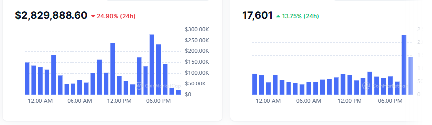 期间成交量下降约25%至283万美元,仍维持午间至傍晚活跃的常态曲线。这种平稳态势表明市场环境保持冷静,即便估值指标发生剧烈变动。
