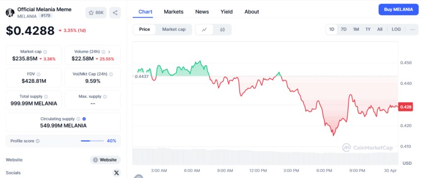 根据CoinMarketCap 4月29日的数据,MELANIA代币当前交易价格为0.4292美元,市值为2.3596亿美元。受此消息影响,MELANIA代币价格在过去24小时内下跌超过3.35%,显现出明显的下行趋势。