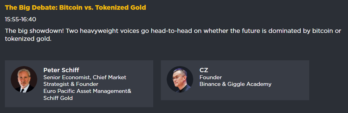 加密货币界乃至更广泛领域最受期待的活动之一,是黄金倡导者彼得·希夫与币安创始人赵长鹏之间关于“比特币与代币化黄金”的辩论。