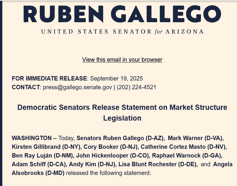 签署者包括在数字资产领域最活跃的民主党议员:纽约州参议员柯尔斯滕·吉利布兰德、新泽西州参议员科里·布克、亚利桑那州众议员鲁本·加莱戈和弗吉尼亚州参议员马克·沃纳等。该团体此前曾提出加密货币监管七大支柱框架,表明他们意在主导讨论而非被动应对共和党提案。