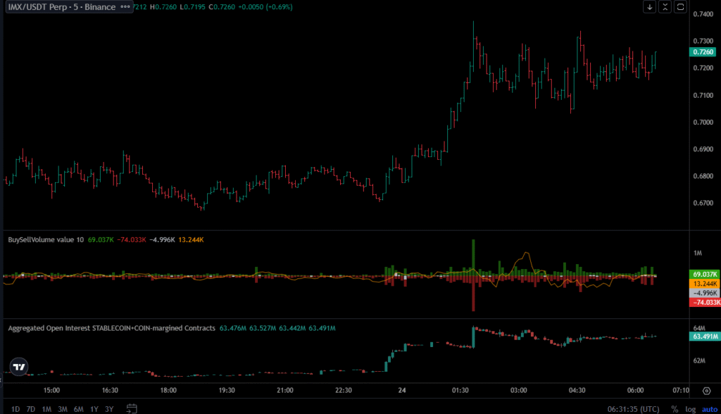 下跌过后,IMX先在0.675-0.695美元区间盘整,随后强势突破。UTC时间01:00左右,价格突破0.720美元并短暂触及0.740美元,最终稳定在0.726美元附近,确认短期趋势反转。