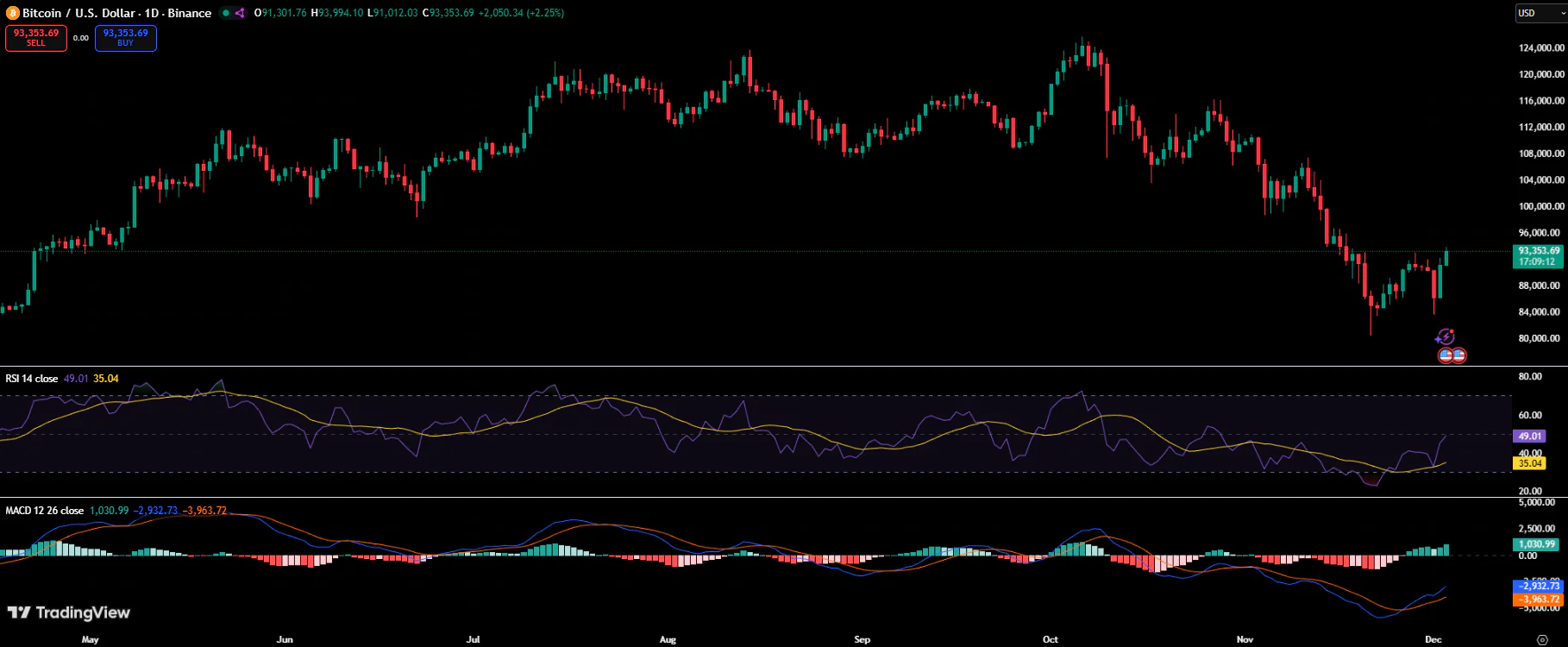 从技术面看,比特币反弹势头正在增强。日线RSI已从超卖区域回升至40多区间,表明卖压缓解且买家正重新掌控市场。
