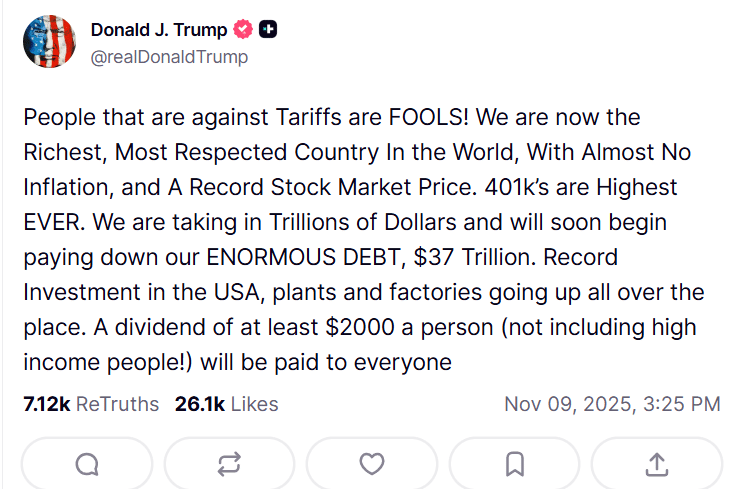 与此同时,特朗普总统周日在其社交媒体平台Truth Social上连续发文,表示其政府计划通过关税收入为美国人提供至少2,000美元的巨额经济刺激。他将其称为对其领导下国家经济实力的奖励。