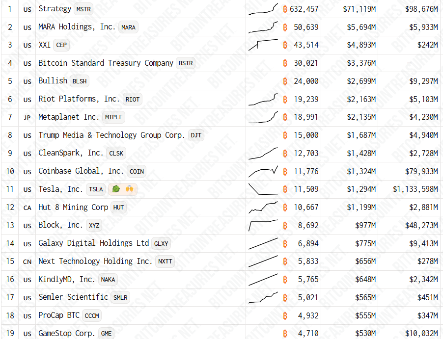 目前比特币储备量榜首是更名为Strategy的公司,持有632,457枚BTC。储备量前六的上市公司均来自美国,而排名第七的Metaplanet(持18,991枚BTC)则是日本投资者。中国企业中,Next Technology和Cano等公司也持有4,000至6,000枚BTC的储备。