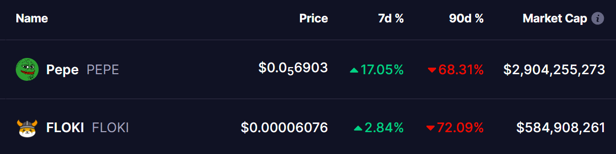 随着市场情绪逐渐回暖,Pepe(PEPE)和Floki(FLOKI)等模因币开始显现强势迹象,在经历了过去90天的重挫后,本周已录得明显涨幅。