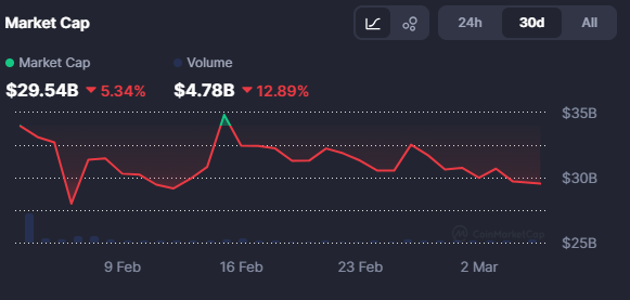 尽管板块整体放缓,但一些与地缘政治热点新闻相关的迷因币价格大幅上涨。CoinMarketCap数据显示,WAR代币市值从2月28日的不到700万美元飙升至3月3日约3000万美元。数据显示,OLIO代币同样上涨,从2月24日的不足200万美元升至3月4日约500万美元高点。
