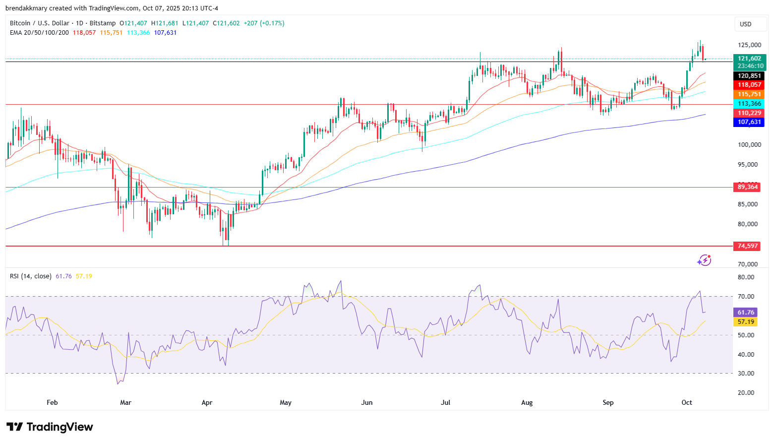 截至2025年10月8日,比特币在从10月6日创下的126,279美元历史高点回落3%后,现交易于121,000美元左右。该加密货币在9月下旬至10月初上涨超过10,000美元后进入盘整阶段。预测市场显示,10月8日比特币交易在120,000-122,000美元区间的概率为38%,另有36%的概率交易在122,000-124,000美元区间。