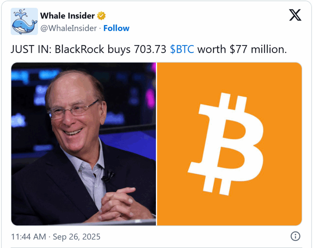 链上数据显示,该公司通过旗下IBIT比特币ETF增持703.7枚BTC,价值约7700万美元。此次最新收购印证了贝莱德稳步累积的战略——不同于一次性买入,该机构持续加仓的行为显示出其对虚拟资产的长期看好态度。