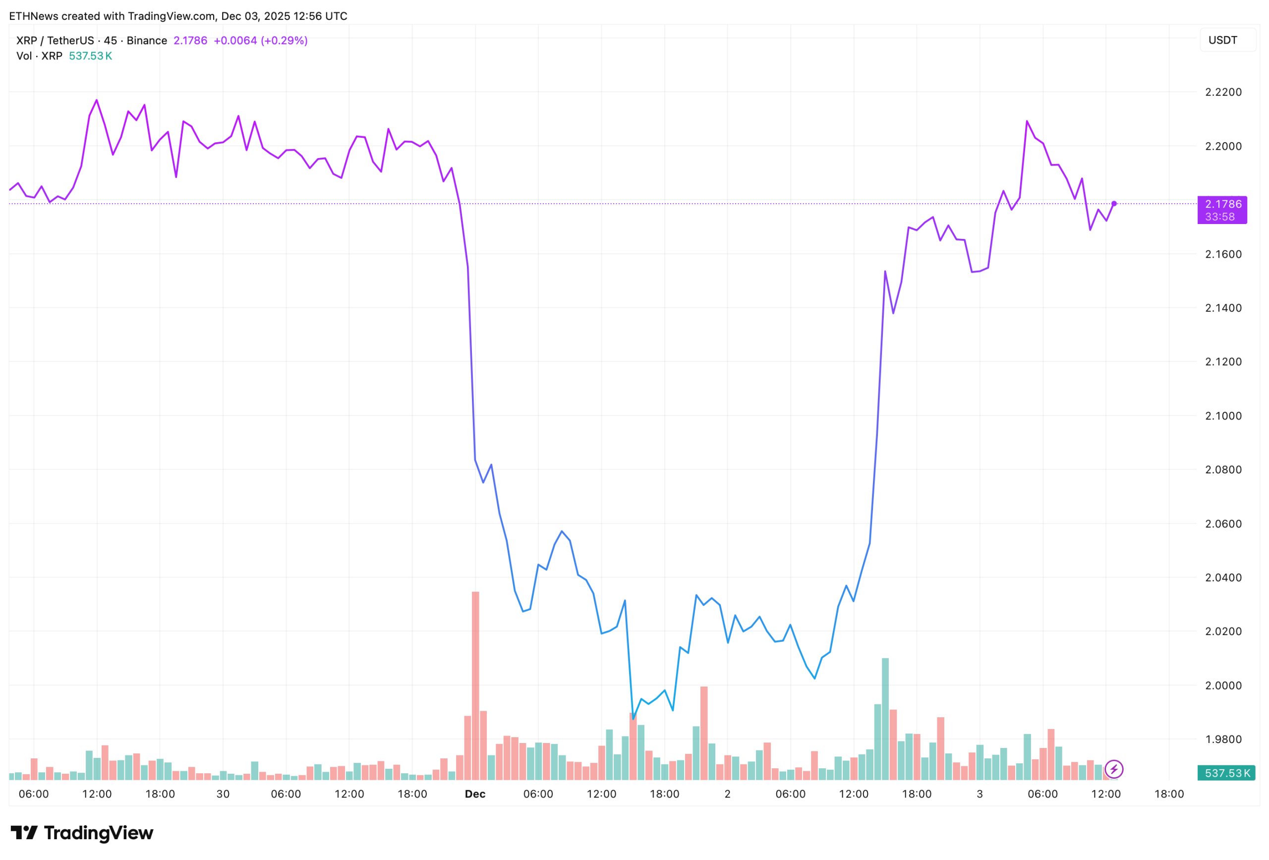图表显示十二月初出现快速下跌,XRP在放量抛售中从2.18美元上方跌至2.00美元下方。此次下跌与大盘的急挫走势相似,但买家在1.98美元附近积极介入,引发了强劲的日内反转。