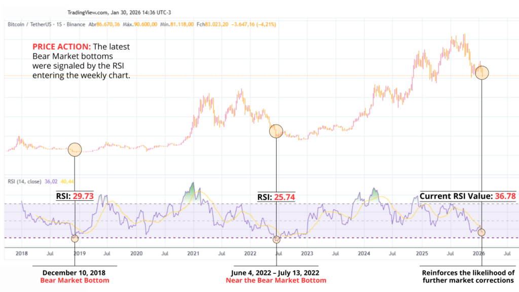 分析将30视为关键的超卖阈值,并指出周度相对强弱指数仅在低于30时才确认熊市底部,例如2018年12月10日的29.73。