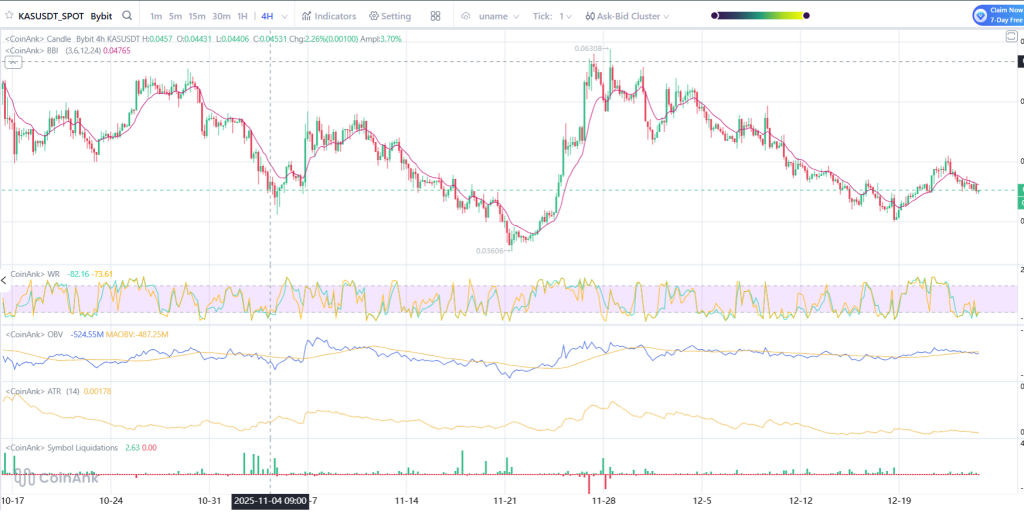 在4小时图表中,卡斯帕价格未能守住11月末的涨幅后,仍处于宽幅震荡阶段。目前价格在0.04-0.045美元区间徘徊,该区域已形成短期平衡带。