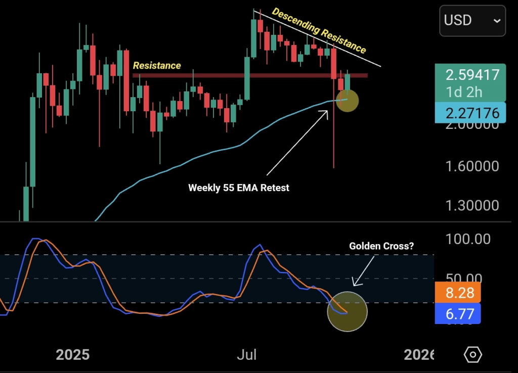 XRP重新测试55周指数移动平均线(EMA),在关键阻力位附近获得支撑并显现强势迹象。