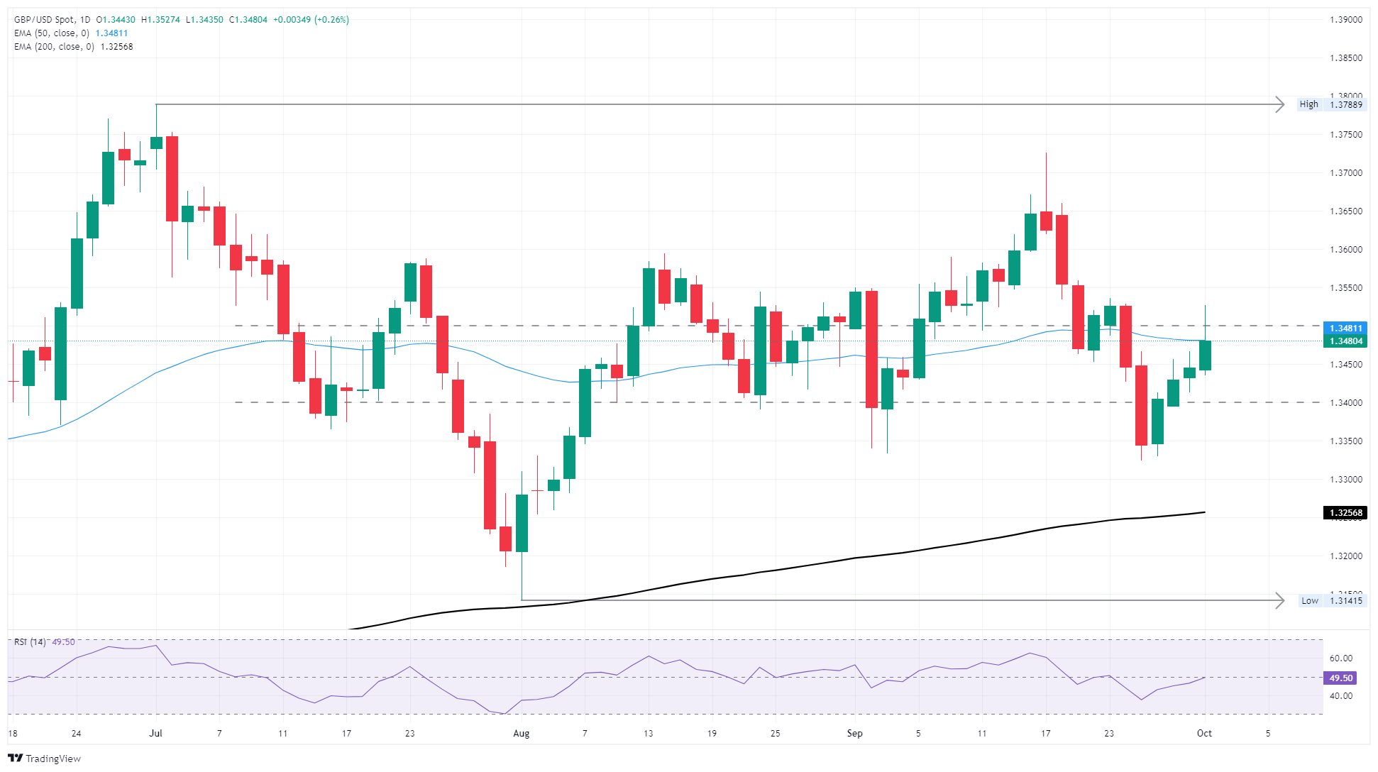 周三,英镑/美元在测试1.3500关口后谨慎上涨。由于投资者努力摆脱美国政府停摆的影响,整体市场动能仍然有限。美国劳工统计局(BLS)的关键劳动力和通胀数据可能在这一利率观察的关键时刻被推迟或暂停。