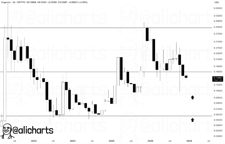 对交易者而言,形势正变得愈发严峻——当前价位下方缺乏有效支撑。分析师指出,随着价格持续下探,在触及0.10美元前几乎不存在有效防御阵地。若失守这个关键节点,下一个重要结构支撑位将下移至0.062美元。这个低位阈值至关重要,因为2022-2023年间狗狗币曾在此横盘整理长达数月。