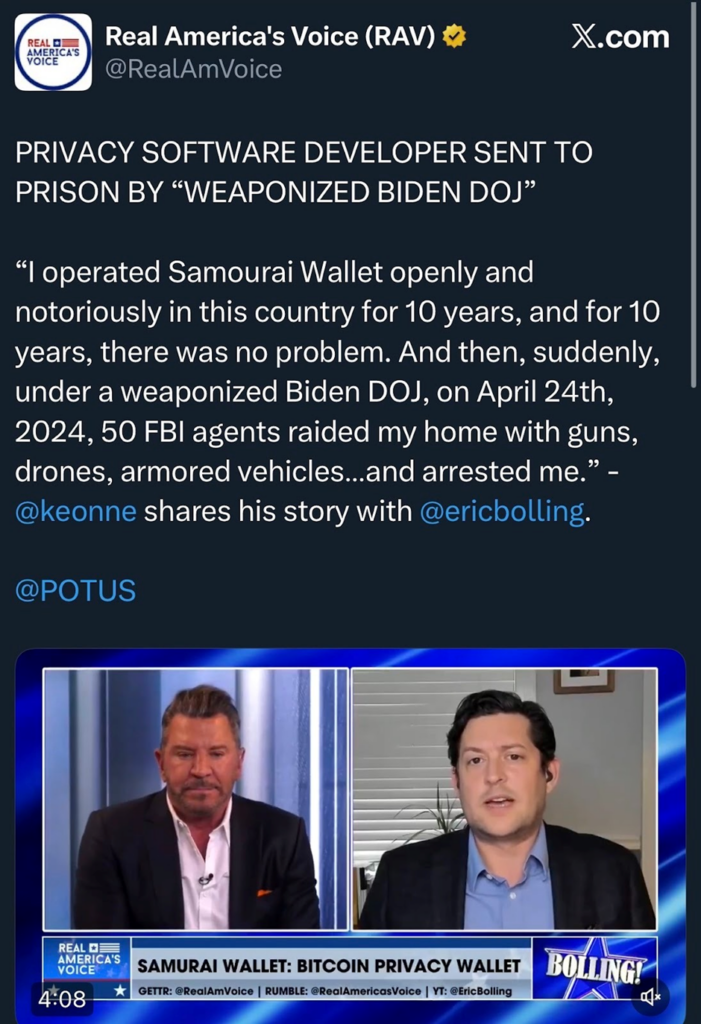 他的表态将案件推向更广泛的人权讨论,警告称若开发者畏惧构建隐私工具,所有人的隐私权都将被削弱。此后该事件进入国家政治层面,众多支持者公开呼吁特朗普考虑特赦Samourai钱包开发者。