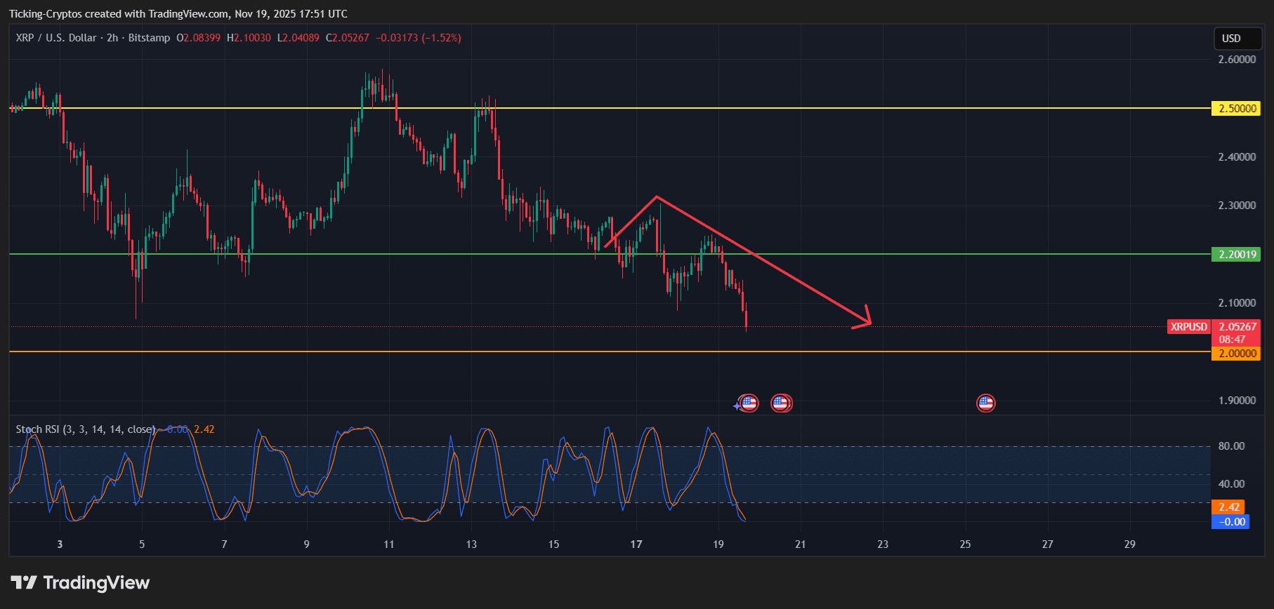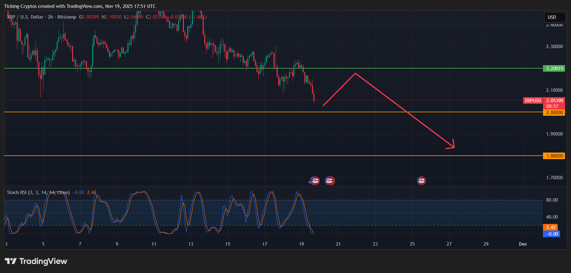 橙色标记的2.00美元关口至关重要。K线图显示高点逐步下移,卖压持续增强。随着比特币跌破9万美元,XRP更多受到宏观恐慌影响而非自身动能。