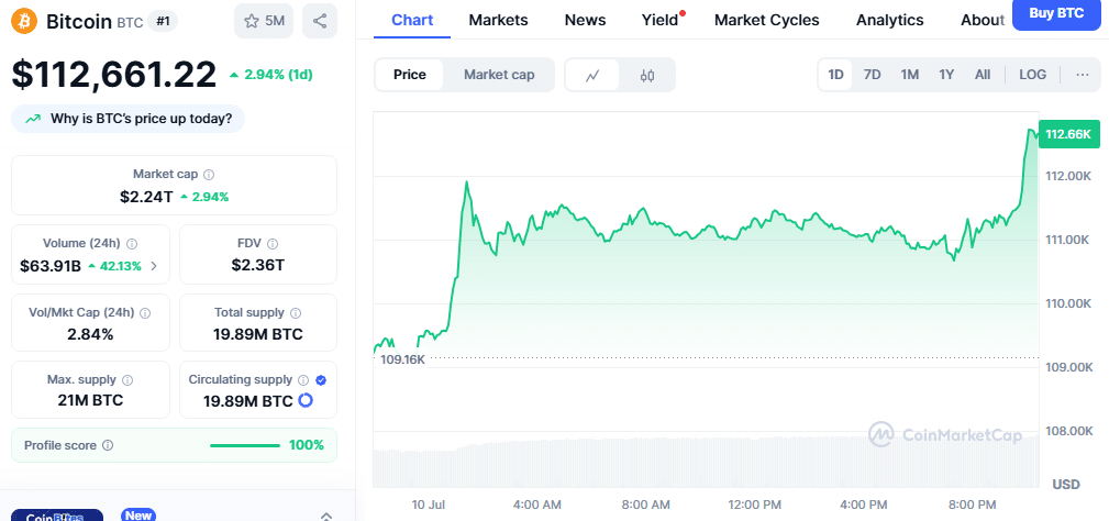 2025年7月10日周四,比特币(BTC)创下112,702.74美元的历史新高,这是自5月以来首次刷新纪录。全球最大加密货币今年已上涨约20%,但在6月下旬曾跌破10万美元关口。