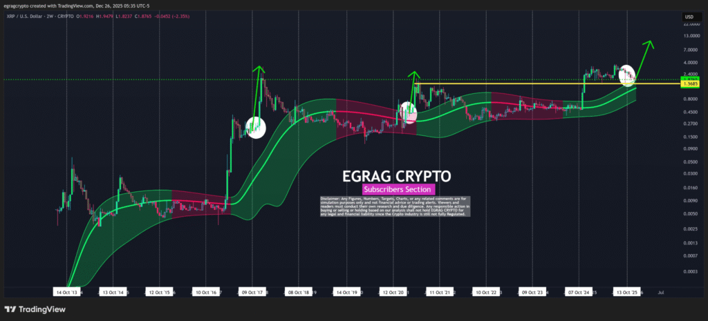目前市场关注两种潜在走势:其一,XRP可能无需经历深度回调而直接延续上涨行情;其二,价格或重新测试关键支撑线,为后续攀升构筑健康基础。EGRAG Crypto认为,若出现第二种情况,价格将下探黄色支撑位后反弹。这条由前期阻力转化的支撑线,预计将成为维持上升趋势的重要基石。