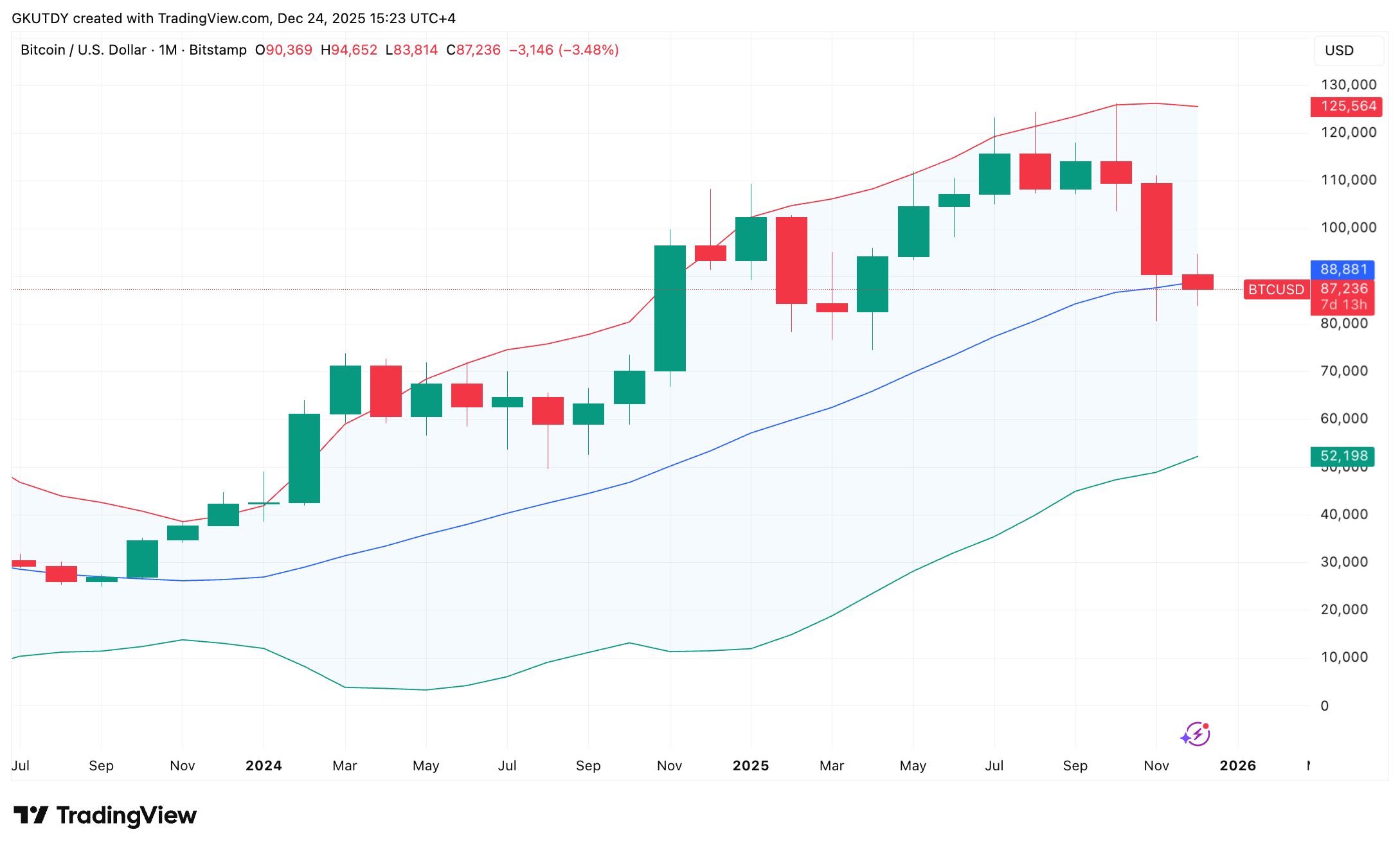 比特币“-39%”标题源自月线布林带图谱,而非量子计算机等突发新闻。在BTC/USD月线图中,价格徘徊于87042美元附近,布林带中轨位于88871美元。这条中轨是专业交易者关注的月线平衡位,当比特币跌破该位置时,下轨便成为明显价格吸引点,市场情绪转向看跌。