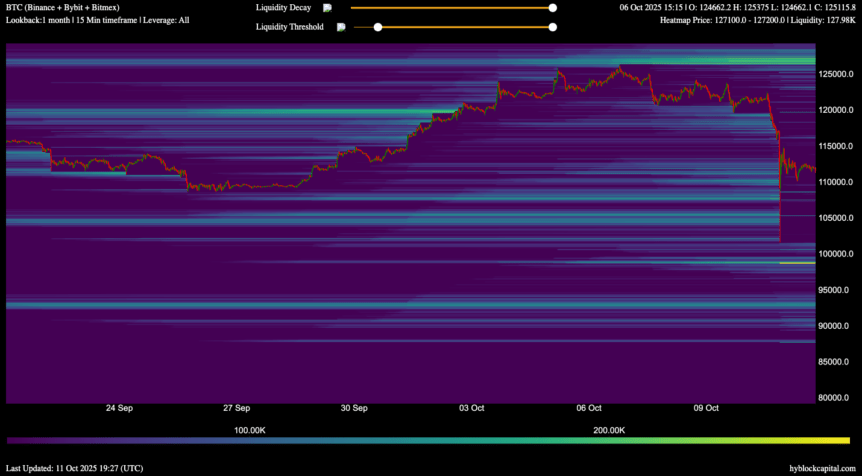 市场分析师Ray Salmond指出,Hyblock Capital的清算热力图数据显示存在大量流动性聚集区域,这些区域的多头头寸极易受到冲击。具体而言,12万至11.3万美元区间存在明显的杠杆交易风险敞口。