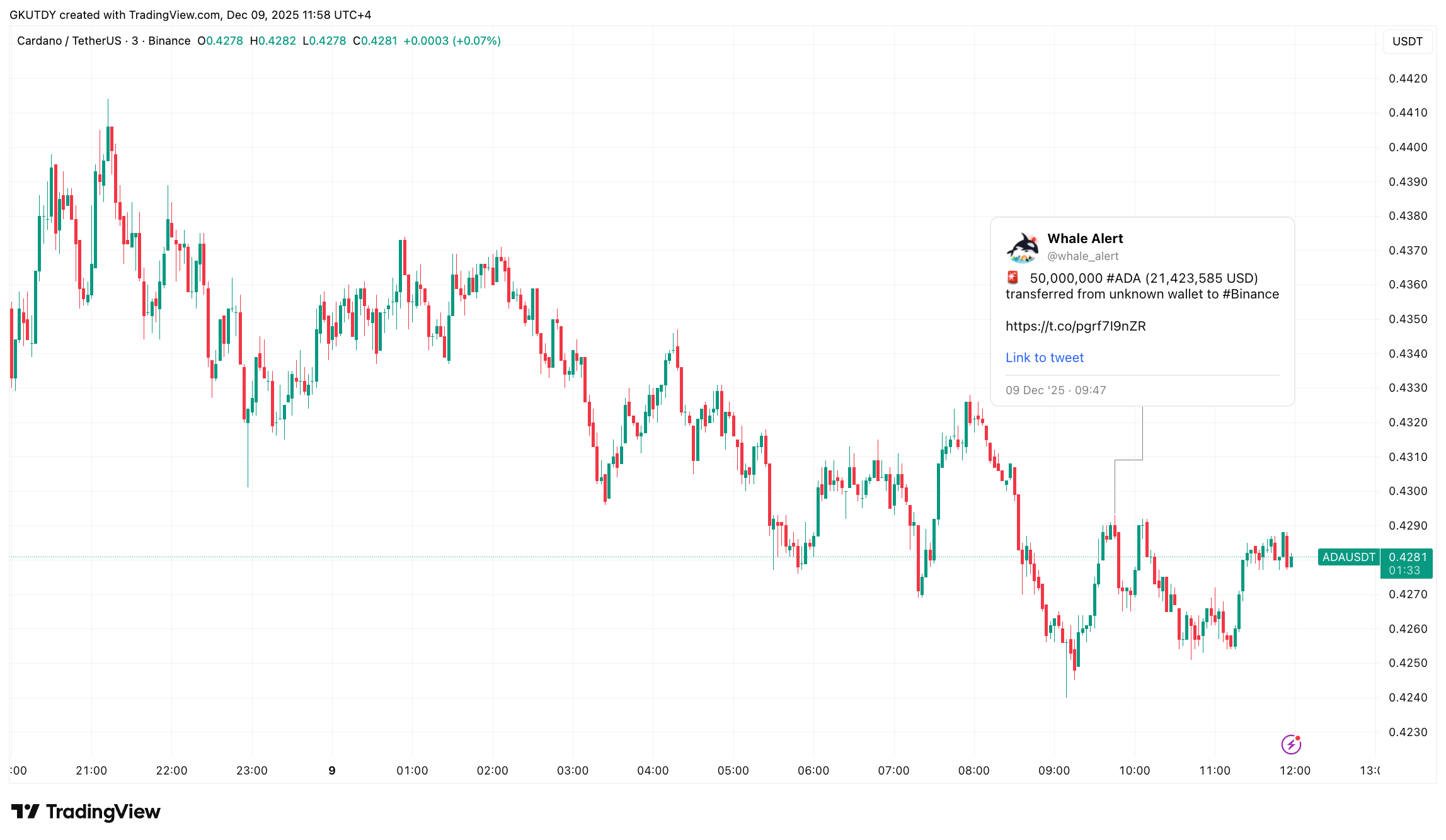 鲸鱼警报系统记录到这笔转账,发送方身份未知,接收地址明确指向币安。时机选择尤为值得玩味:ADA价格正停滞在0.427美元附近,既无明确趋势也缺乏动能,多空双方均未形成有效布局。