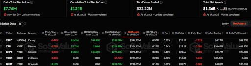 GXRP(Grayscale,纽交所)在1月26日同样未录得资金流入或流出,累计净流入维持2.32亿美元,净资产2.12亿美元。日成交额486万美元,收盘价36.73美元,日跌幅1.08%。