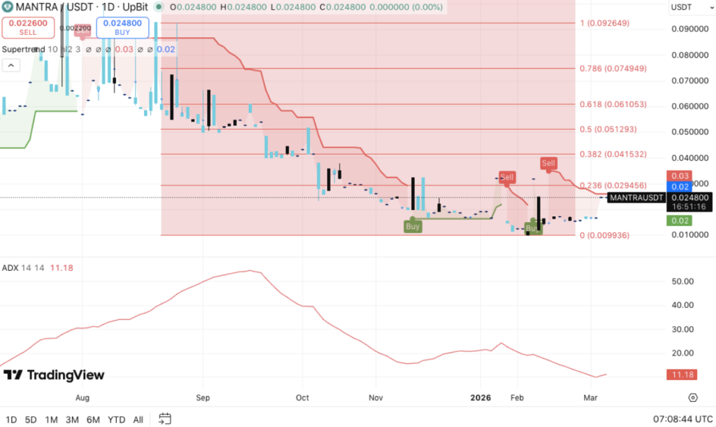 技术指标显示市场整体动能有限,平均趋向指数维持在11附近,表明趋势强度非常薄弱。当ADX低于20时,市场通常倾向于进入盘整而非强势单边行情。因此MANTRA目前正处于价格横盘运行的典型前兆阶段。此外,超级趋势指标仍显示看跌结构,但动能的减弱暗示卖方短期控制力可能正在流失。