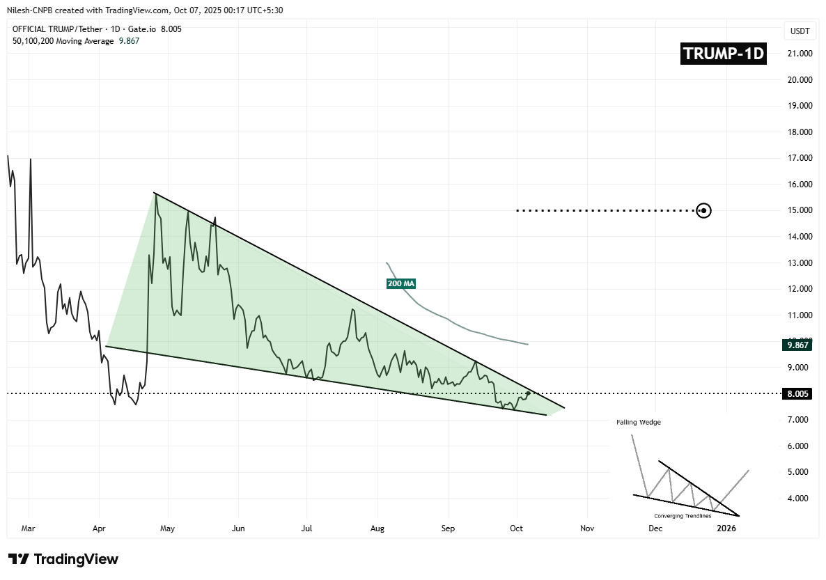 若能成功突破楔形阻力并站稳200日均线上方,TRUMP可能开启强势上涨行情,目标价位看至15美元,较当前水平存在超86%的上涨空间。这样的突破不仅将终结数月来的盘整格局,还可能吸引动量交易者的新资金流入,进一步推升涨势。