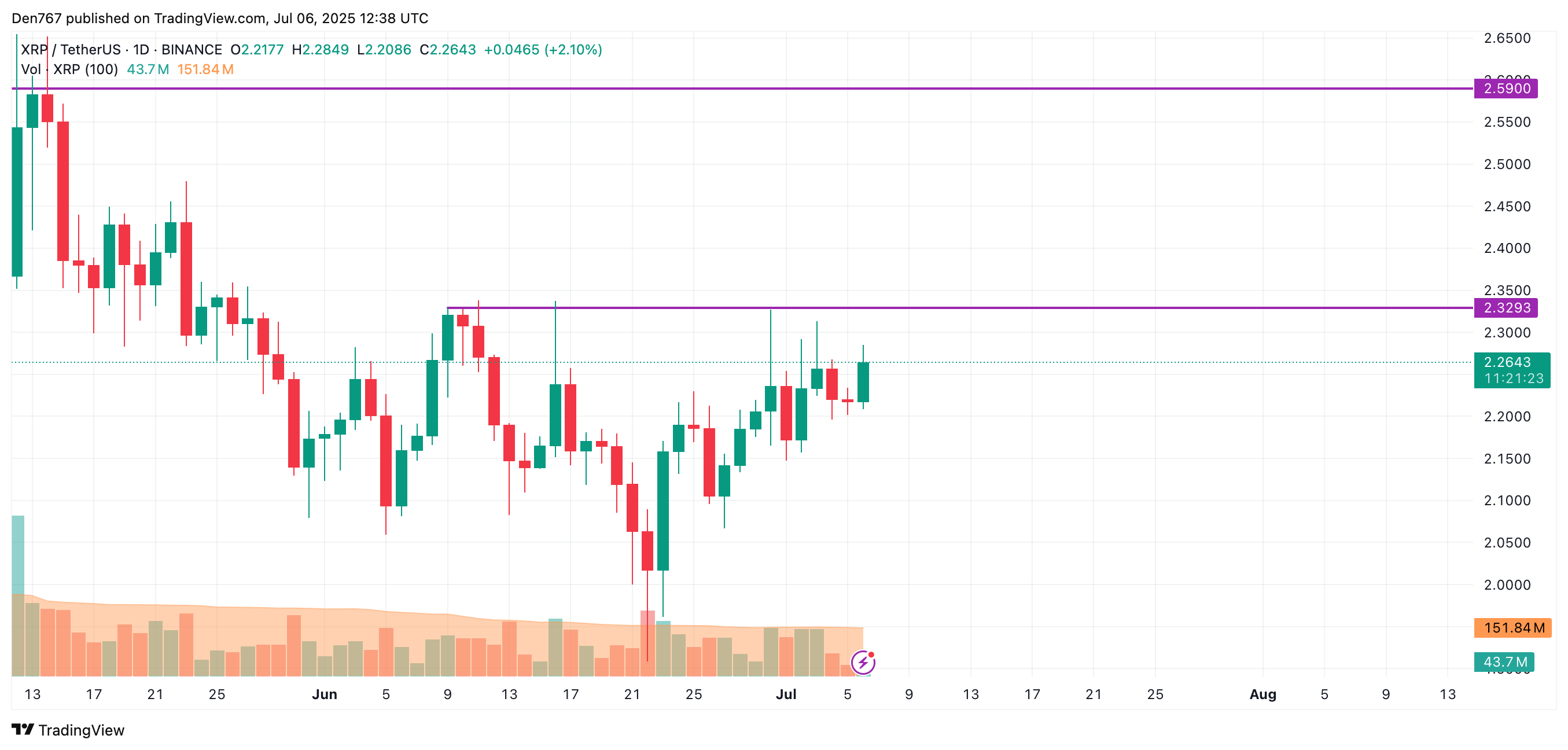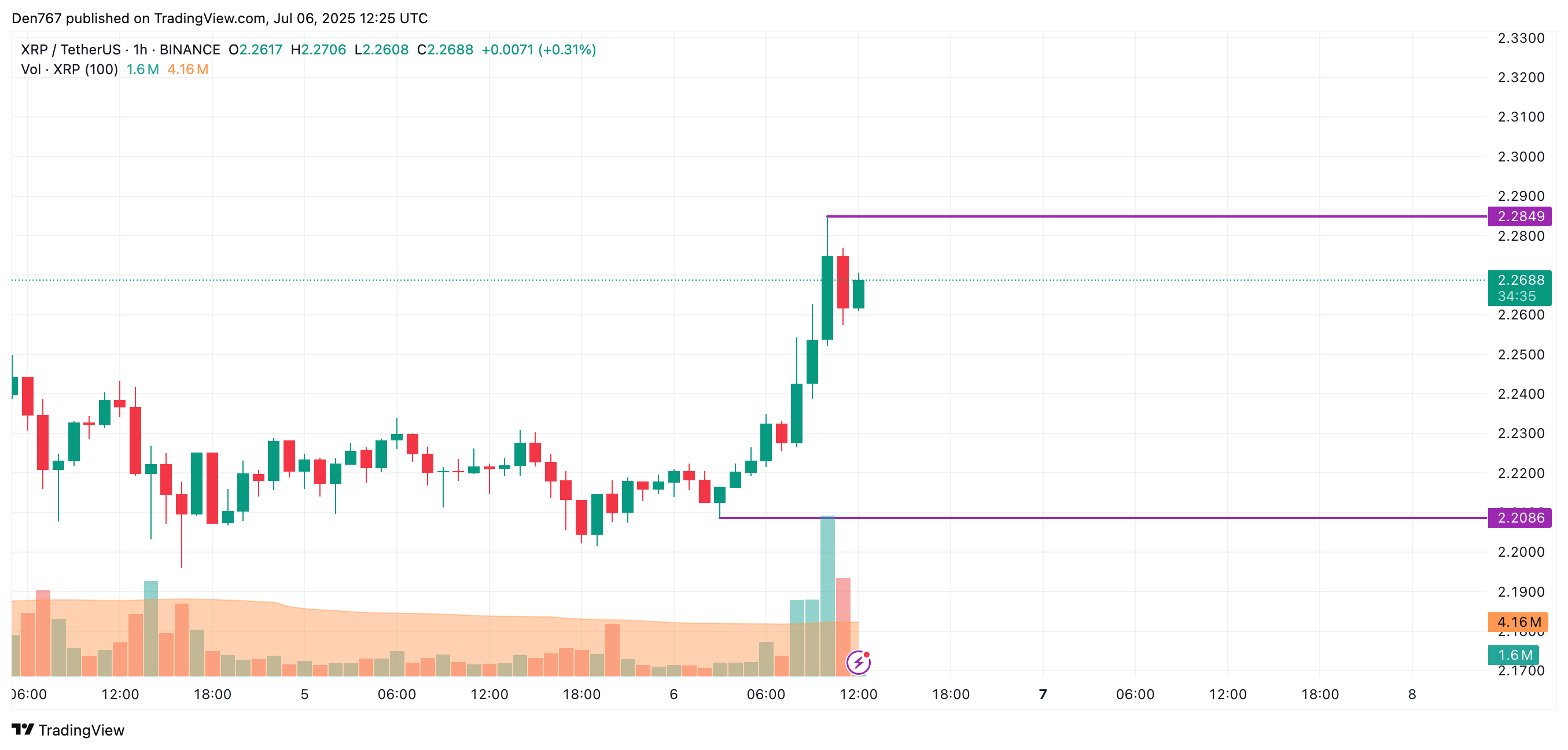 小时图显示,XRP正逼近2.2849美元局部阻力位。若日线收盘能站稳该价位附近,明日或将测试2.30美元关口。