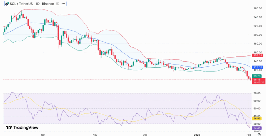 Solana (SOL) 十个月来首次跌破关键的100美元心理关口,日内下跌6.3%后,交易价格报98.03美元。上一次见到该价位还是在2025年4月,这凸显了下跌趋势的加剧——过去一周,该代币价值已缩水近20%。在过去30天里,SOL下跌了约25%,创下自2023年初以来最剧烈的月度跌幅。