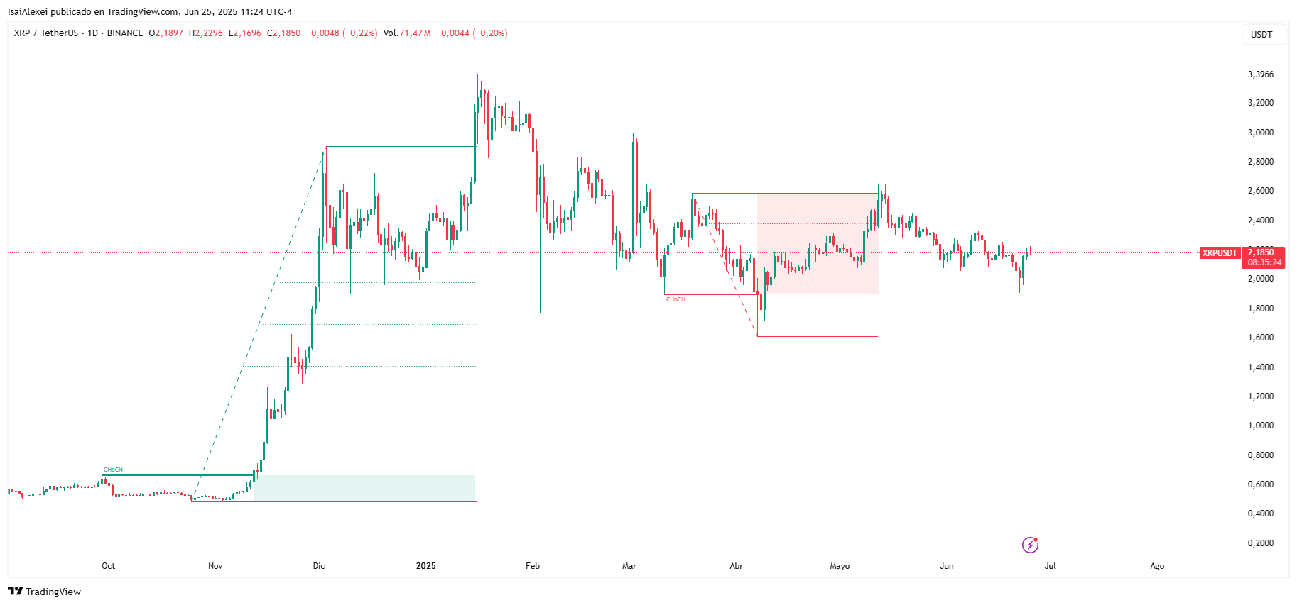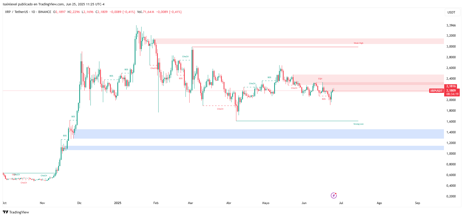 XRP短期上升通道形态完整,即时支撑位2.15美元,阻力位2.25美元。若有效突破2.25美元,或将测试2.40美元关键位;反之若失守2.15美元,可能回撤至5月底形成的2.00–2.05美元积累区间。
