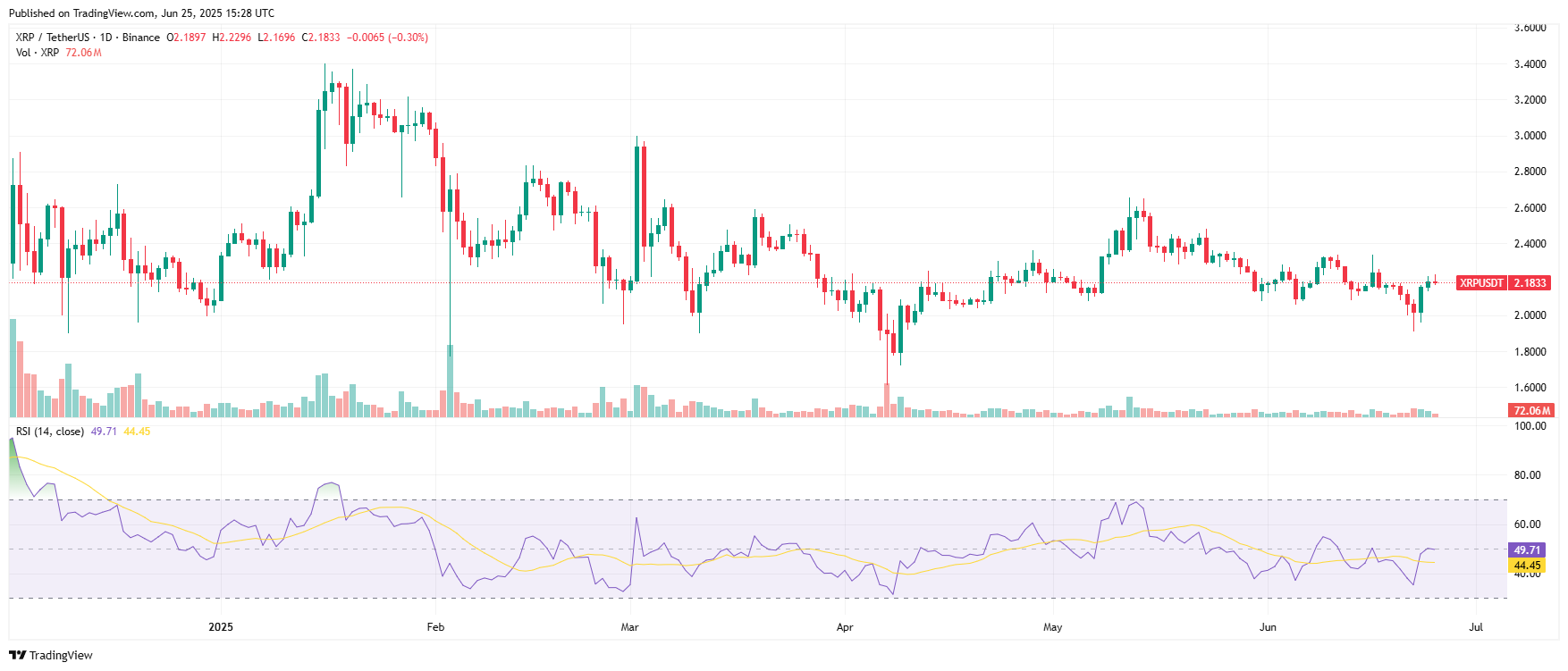 相对强弱指数(RSI)徘徊于50中性区域,显示多空动能均衡。XRP仍远高于50日均线,表明宏观趋势未受短期盘整影响。