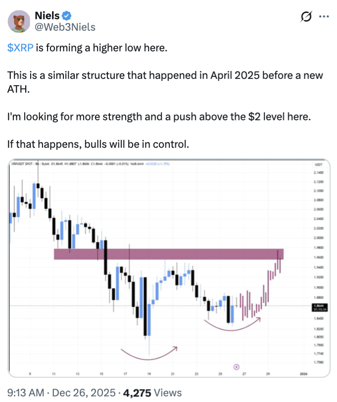 新年伊始,市场分析师指出,在看涨催化剂真正显现之前,XRP价格可能保持相对稳定,不会出现显著上涨或下跌。虽然部分观察者看到了积极发展的可能性,但在加密货币市场整体不确定的背景下,市场情绪仍以谨慎为主。