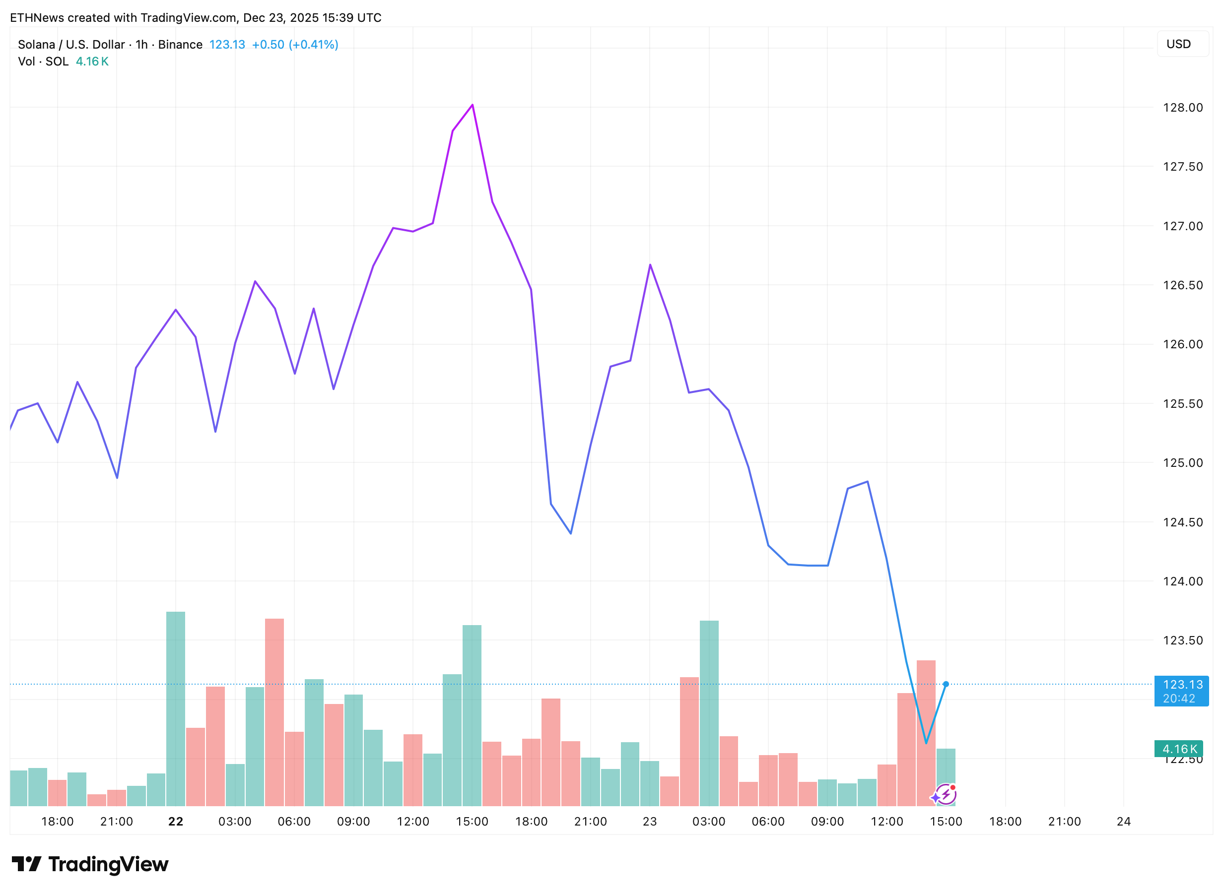 Solana目前交易价格约为122.9美元,正位于一个重新变得关键的区域。经过数日的持续下行压力后,价格下跌动能已不再加速,反而开始放缓、收窄,并在此水平附近表现出更谨慎的反应。