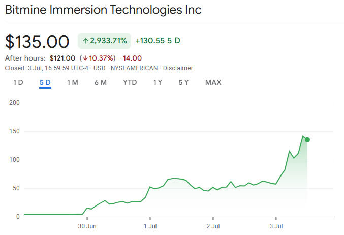 市场反应极为强烈——谷歌财经数据显示,自公告发布以来Bitmine Immersion Technologies(BNMR)股价暴涨2934%,周四最高触及140美元,较上周4.27美元的收盘价实现惊人飞跃。