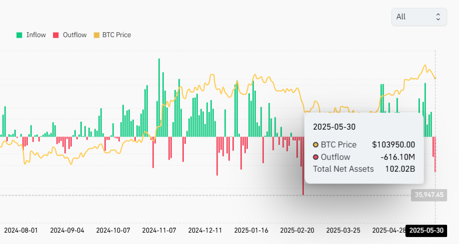 最近两个交易日成为美国比特币现货ETF自2月下旬以来最悲观时期。5月29日与30日合计,主要比特币ETF的管理规模缩水9.75亿美元,其中最后一个交易日更跻身现货BTCETF史上五大最严重资金外流之列。