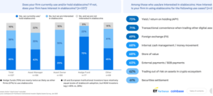 特别是稳定币,正获得越来越多的关注。84%的投资者正在使用或表示有兴趣使用稳定币,这清楚地表明这些数字资产不再仅仅用于加密货币交易。投资者正在利用稳定币实现多种用途,从产生收益(73%)到促进外汇交易(69%)和管理内部现金(68%)。越来越多人将稳定币视为金融世界中的多功能工具。