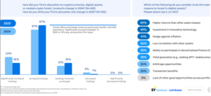 调查的一个关键发现是,绝大多数投资者计划在2025年将其管理资产(AUM)的5%以上配置到加密货币中。83%的受访投资者打算增加加密货币配置,这源于他们相信在未来几年内,加密货币将提供最具吸引力的风险调整回报。这清楚地表明,加密货币正在超越其小众地位,成为机构投资组合中的主流资产。