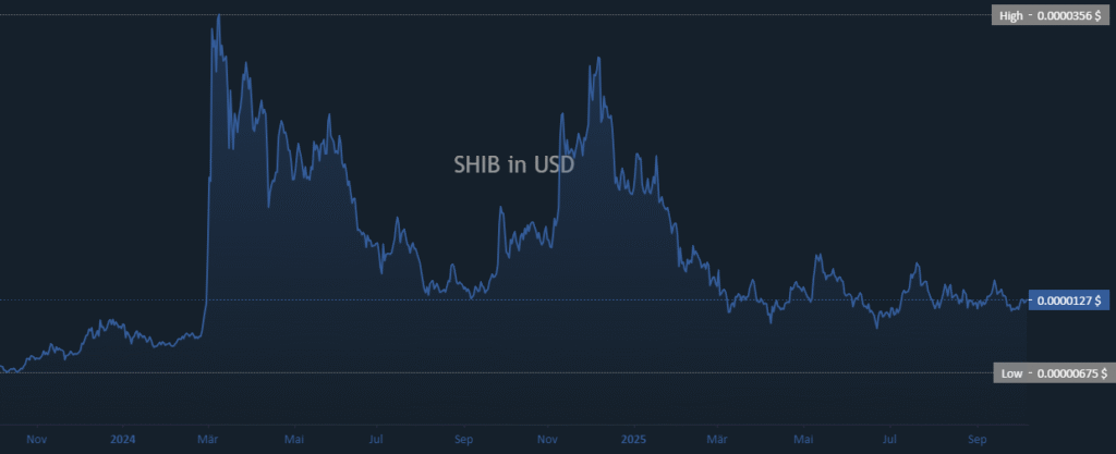从2023年末至2025年,SHIB经历了典型的暴涨-暴跌-企稳周期。2024年初的飙升后,价格于2025年中期进入横盘整理,这种筑底形态为后续动能恢复奠定了基础。历史数据显示,模因币在长期盘整后往往会出现快速趋势反转。