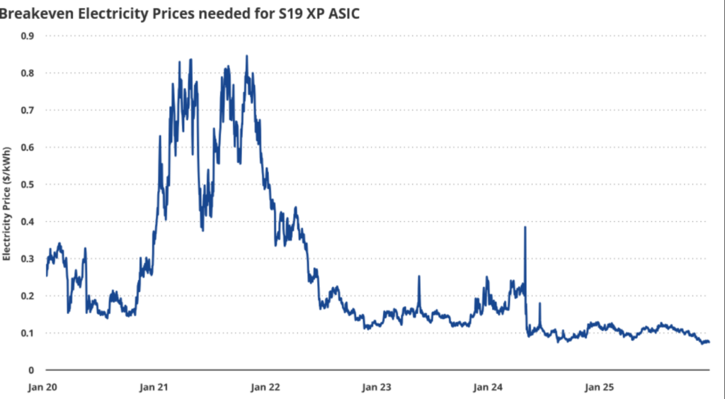 矿工盈亏平衡压力同样显现:2022款Bitmain S19 XP矿机电力成本已从2024年12月的每千瓦时0.12美元降至0.077美元,降幅达36%。这反映出矿工正面临严峻挑战——4%的算力降幅创下2024年4月以来最大记录,主要源于中国约1.3吉瓦挖矿产能的关停。分析师指出,这部分电力可能转向支撑AI需求,预计将使比特币算力再降10%。